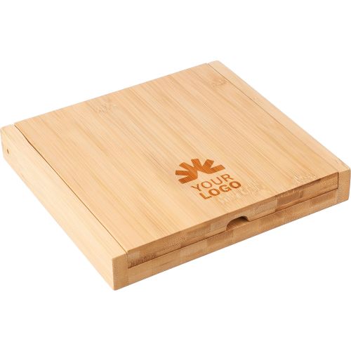 Bamboo cheese board with fold-out design, including four stainless steel cutlery pieces with beechwood handles. Convenient storage compartment keeps the cutlery neatly tucked inside. Individually packaged in a brown cardboard box.