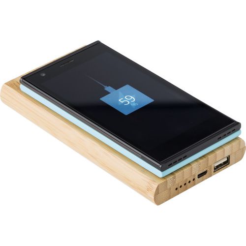 Bamboo power bank with a capacity of 6.000 mAh, with wireless technology. Input DC 5V/2A. Output DC 5V / 2A. Wireless charging 5V/1A. Li-polymer battery. Including LED indicators and charging cable (USB – micro USB).