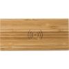 Bamboo wireless charger of 5W, with integrated LED clock display with white light. The charger has a micro USB port. Buttons on the bottom for setting the time. Including cable and batteries.