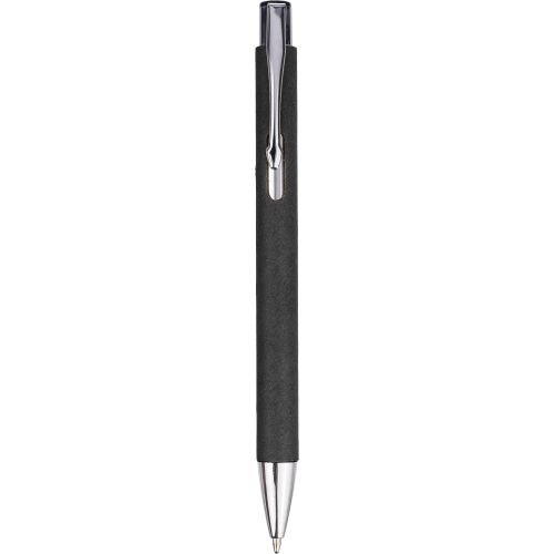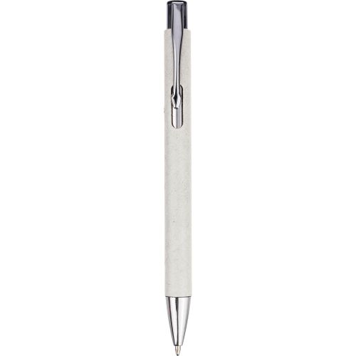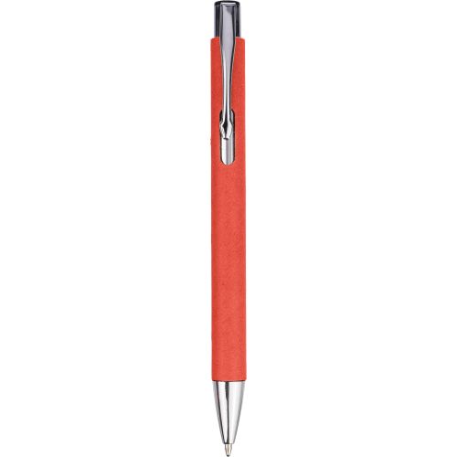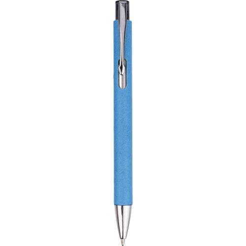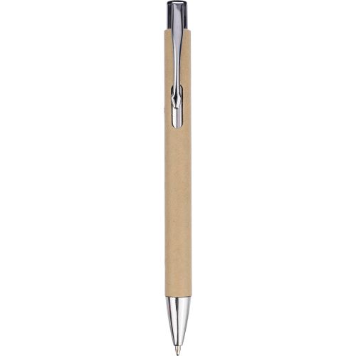 Recycled carton ballpoint pen with chrome details. Tip and push button in plastic, and metal clip. Approx. 800 meters of writing length, blue ink.