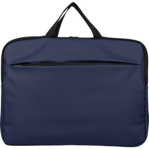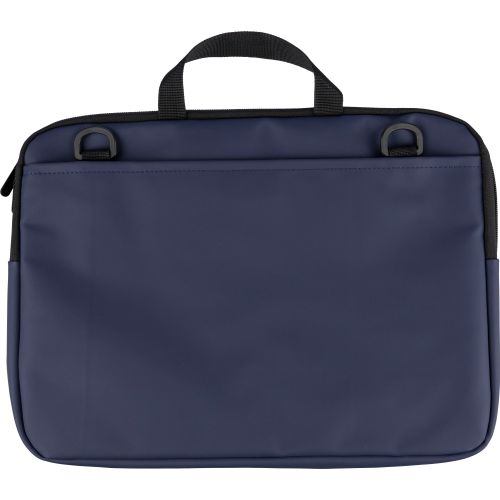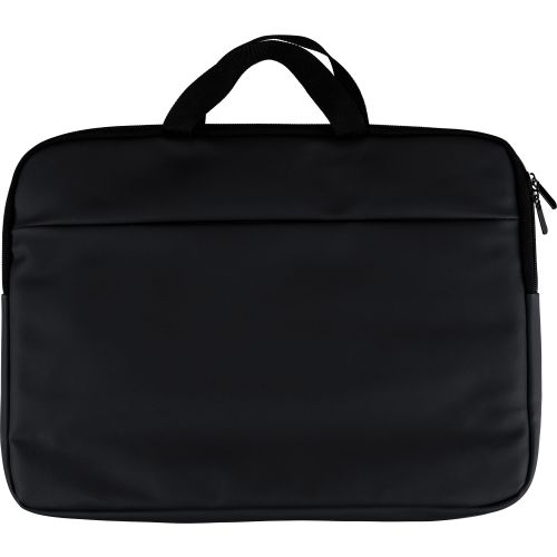 Recycled PU laptop bag suitable for laptops up to 15 inches, with 4 mm padding and 210D recycled polyester lining. Features a zippered front pocket, velcro-closed pocket on the backside, two short carrying handles, and an adjustable shoulder strap. Includes a small recycled logo in the inside label.