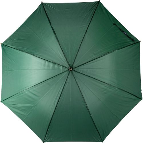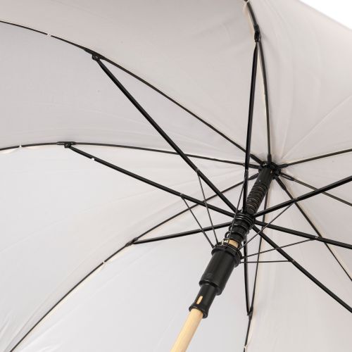 rPET 190T automatic golf umbrella with eight panels and bamboo handle. Bamboo and steel shaft with metal frame. Includes velcro closing strap and rPET label.
