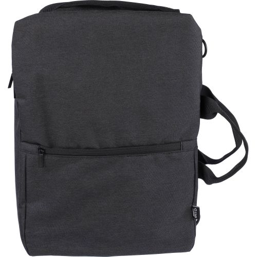 rPET polyester (300D) backpack and laptop bag (15 inch) with 210D lining inside. Cabin-proof. With carrying loop on top, adjustable shoulder straps, and two carrying handles on the side. Adjustable straps tuck behind the padding for a carry function with side handles. Velcro laptop compartment and small zippered compartment. With ventilated padded backing. Carrying weight approx. 8 kg. Includes rPET label.