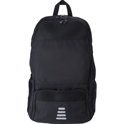 RPET polyester multi-functional backpack. 210D lining and RPET 600D outside. Function include: racket pocket, anti-theft pocket, shoe pocket, laptop pocket, bottle compartments. The bag has padded adjustable straps and is water repellent (recycled coating).