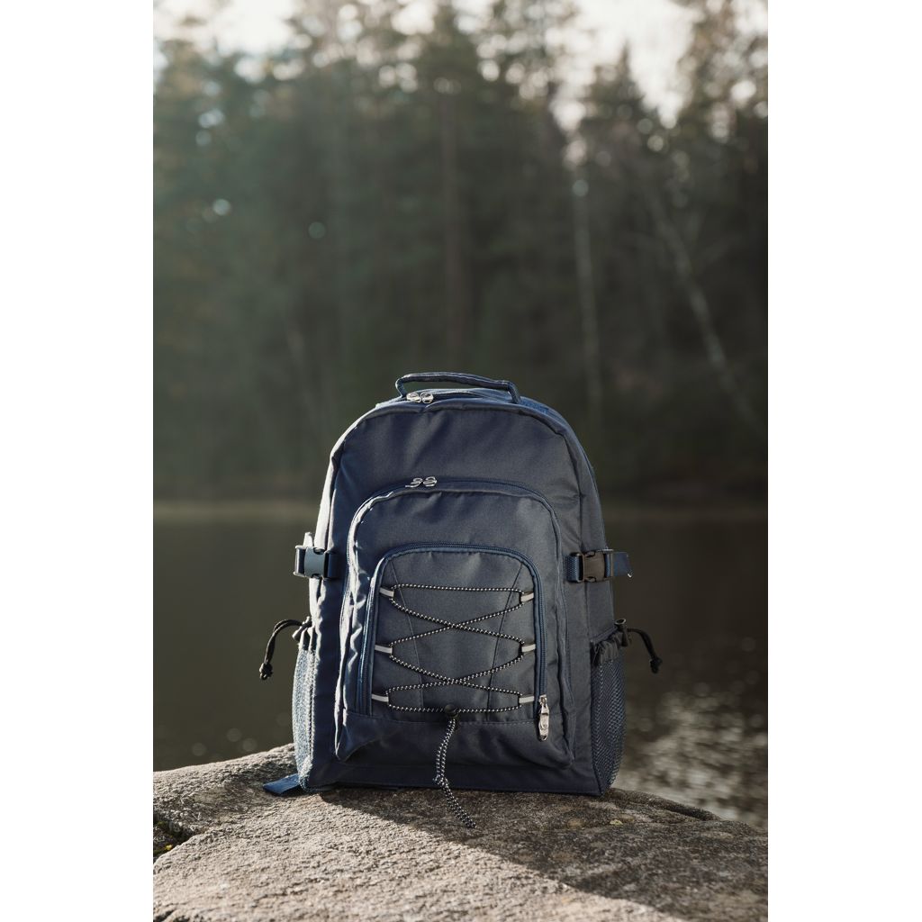 Spacious backpack with cooling function and many compartments. 600D polyester.