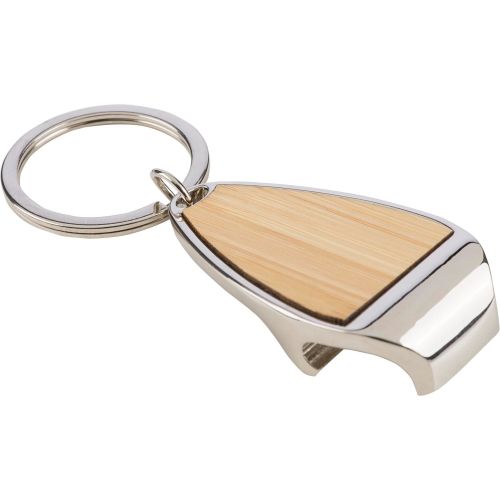 Zinc alloy keychain with metal keyring and bamboo inlay on the front. Features a bottle opener function. Packed in a paper bag.