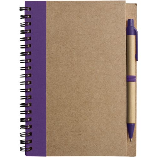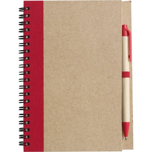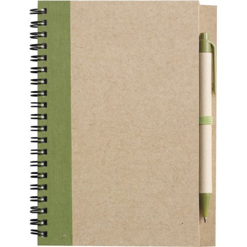 Recycled cardboard, wire bound notebook with 60 lined pages and ballpen with biodegradable parts and blue ink. 100% Recycled paper.