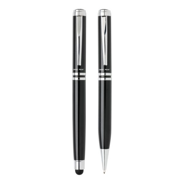 | Description | Authentic pen set bearing all the hallmarks of classic quality. High quality heavy brass metal rollerball with stylus and ball point pen with Swiss Peak branding. Including premium PU leather pouch and giftbox. Blue ink. |